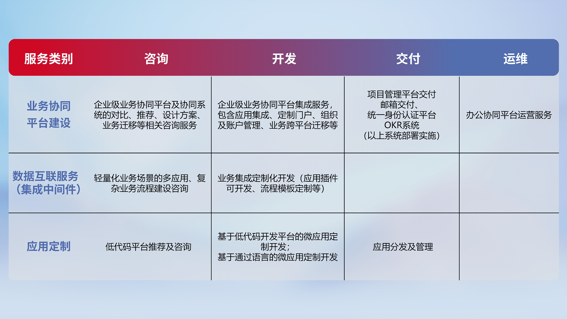 针对钉钉、、企微、、、、IDaas等平台级产品提供产品的规划、、、方案、、交付、、、定制化开发等服务,,,实现如统一协同办公、、智能客户服务、、混合会议管理、、智能数据查询、、、等业务场景,,,实现数字化转型。。。
